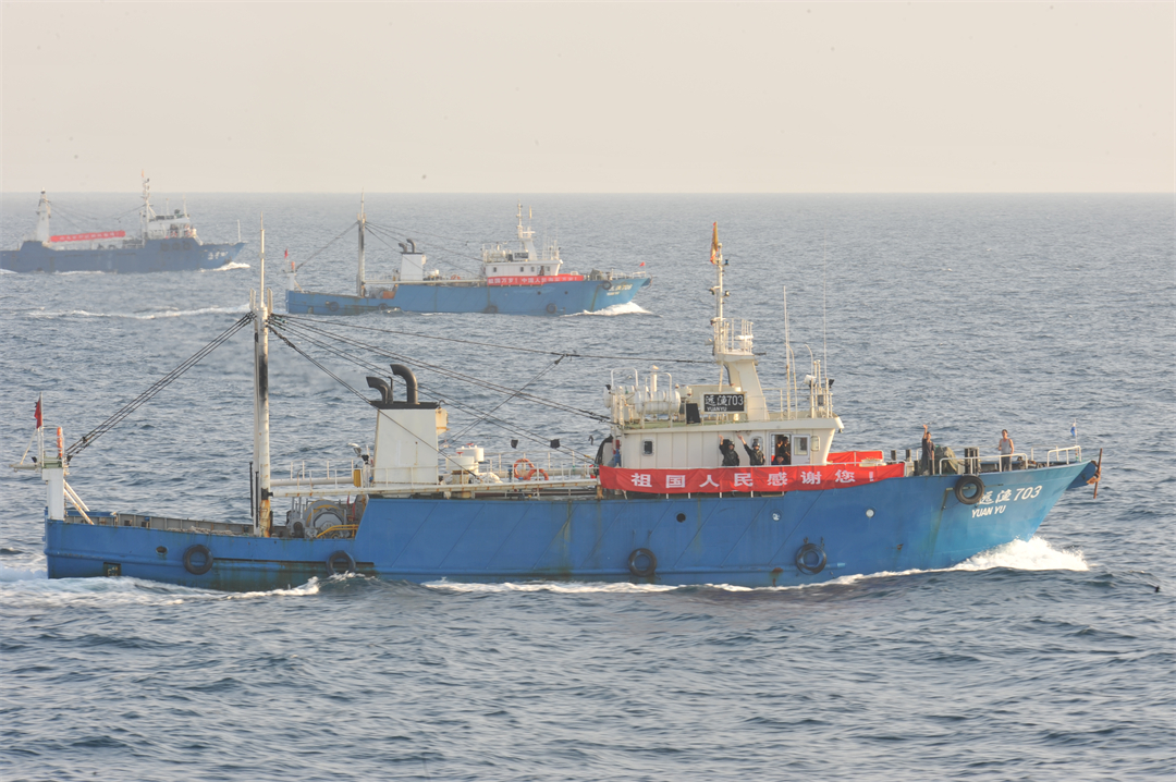 圖為2022年6月3日至6月5日,海軍岳陽艦正在執(zhí)行第1500批護航任務(wù),為多艘大連籍遠洋漁船護航。楊捷 攝