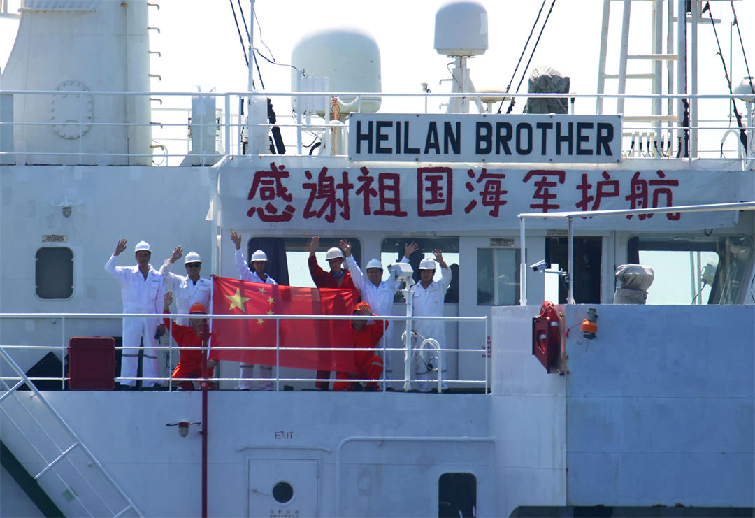 圖為2022年11月5日,在亞丁灣上“海瀾之友”散貨船船員安全感“爆棚”,自發(fā)地懸掛起“感謝祖國海軍護航”的橫幅,并跑上甲板,興奮地展開五星紅旗,向淮南艦揮手致謝。馬玉彬 攝
