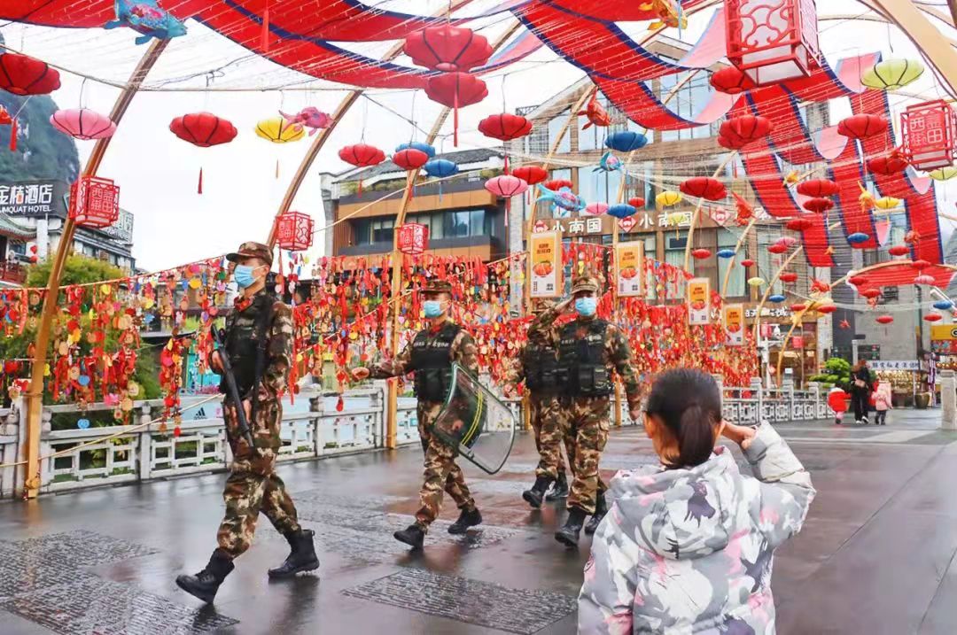 圖為春節(jié)期間,武警陽(yáng)朔中隊(duì)官兵在陽(yáng)朔西街開(kāi)展巡邏勤務(wù)。