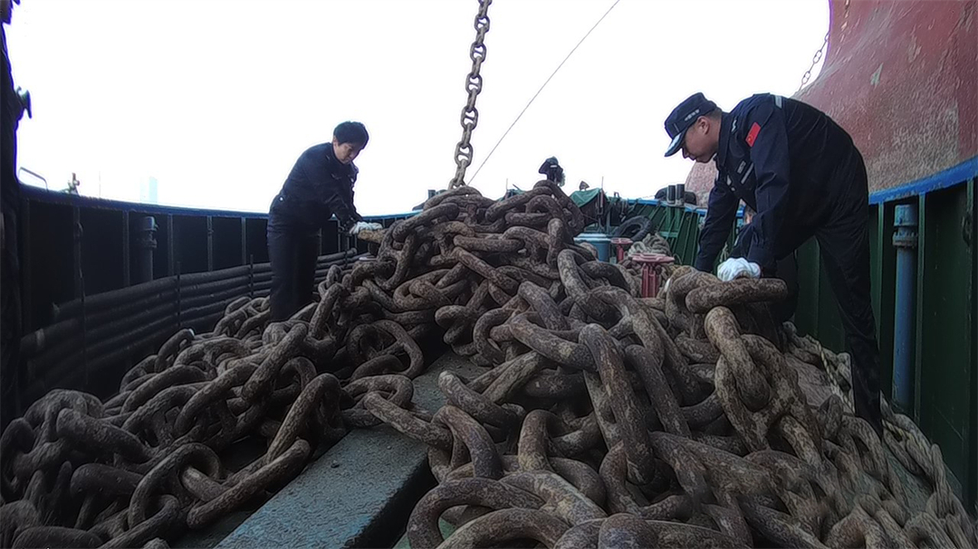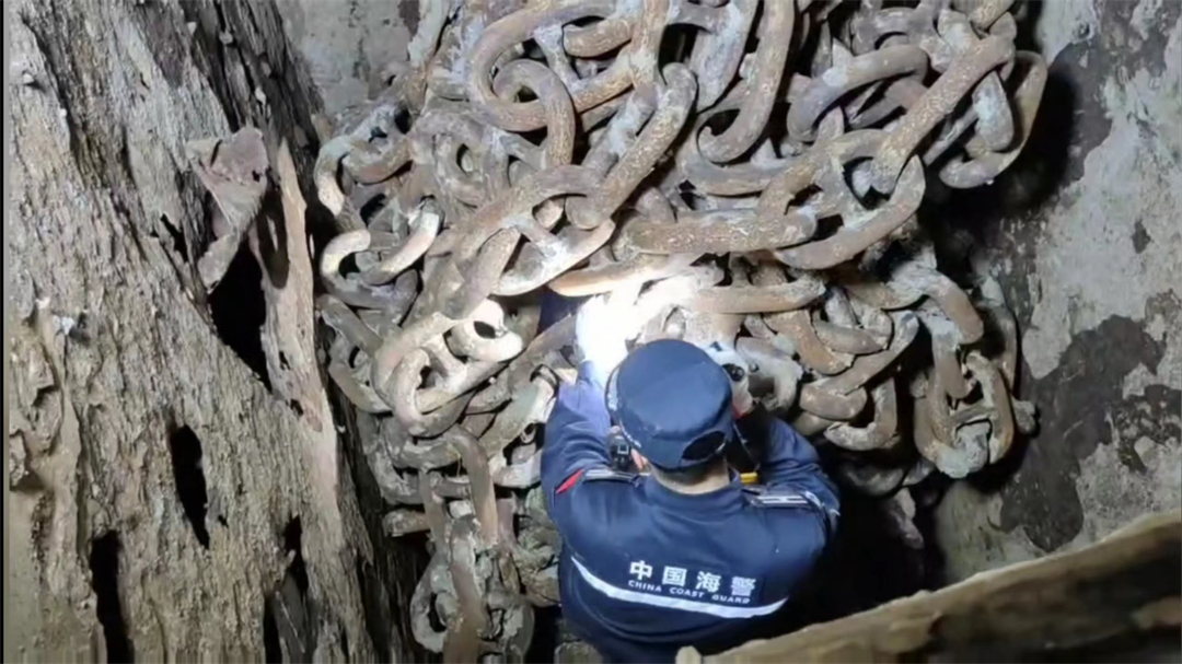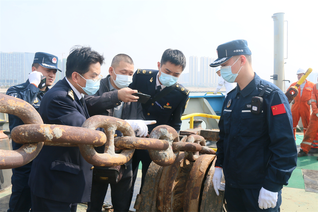 圖為廣東海警局與海事局工作人員對海纜案涉案船舶錨鏈進行檢查。