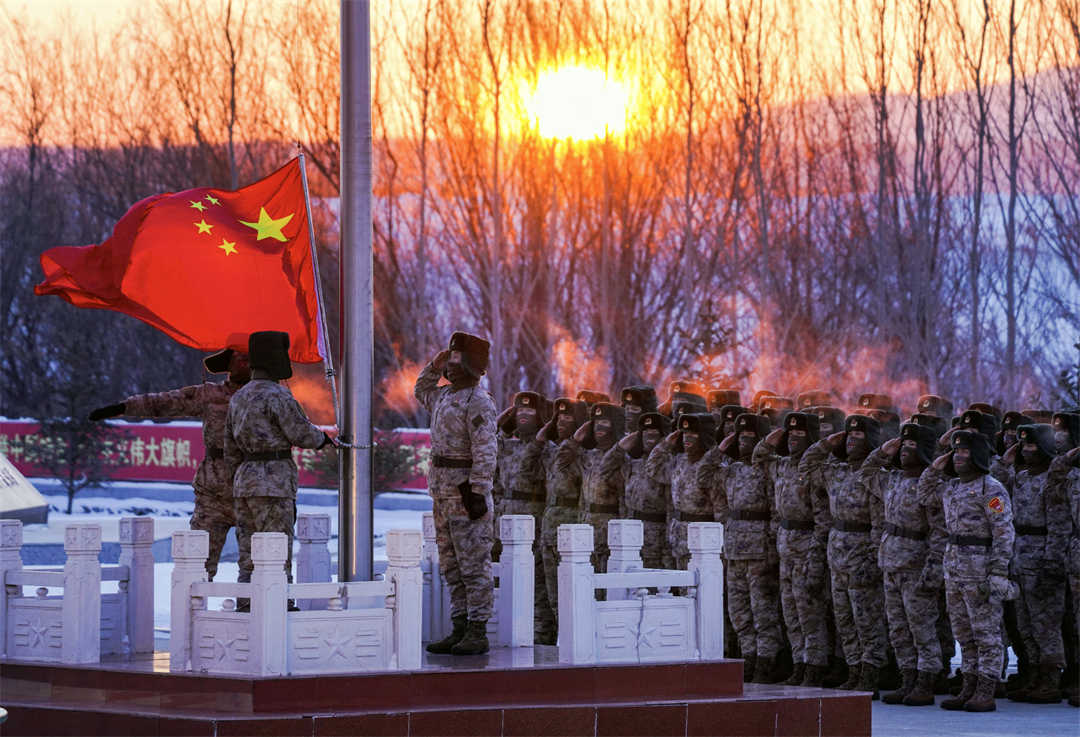 近日,駐守在黑龍江省撫遠(yuǎn)市黑瞎子島的陸軍某邊防旅“東方第一哨”官兵迎著祖國(guó)第一縷朝陽(yáng),升起鮮艷的五星紅旗。