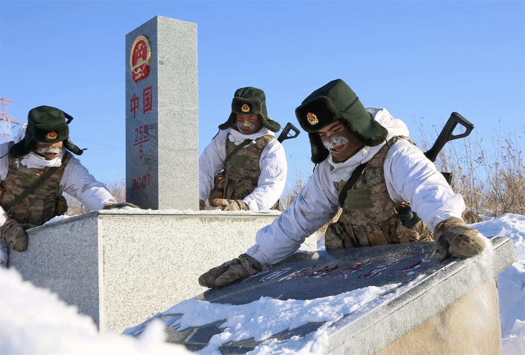 圖為陸軍某邊防旅“東方第一哨”官兵在巡邏途中,清理界碑前積雪。