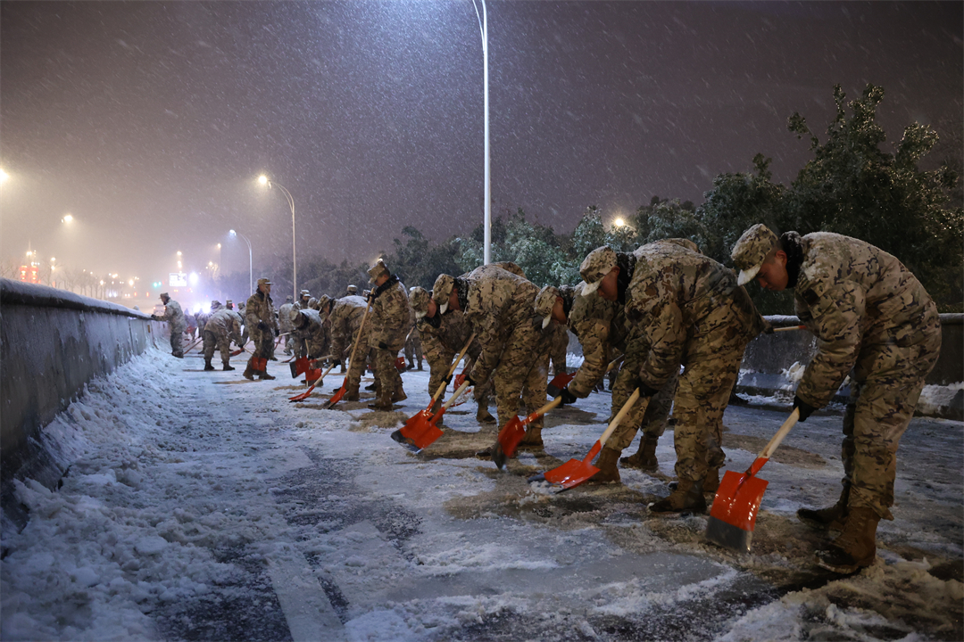 4日凌晨,武警湖北總隊(duì)訓(xùn)練基地接到駐地政府救援請(qǐng)求,駐地金山大道、臨空港大道等周邊多條高架和快速路匝道結(jié)冰,進(jìn)出車(chē)輛通行受到嚴(yán)重影響,已發(fā)生多起車(chē)禍。2時(shí)30分許,他們緊急出動(dòng)投入到破冰搶險(xiǎn)工作中,至4日8時(shí),累計(jì)清理結(jié)冰道路2公里,清掃積雪15000多平方米,得到地方政府和人民群眾的高度贊譽(yù)。