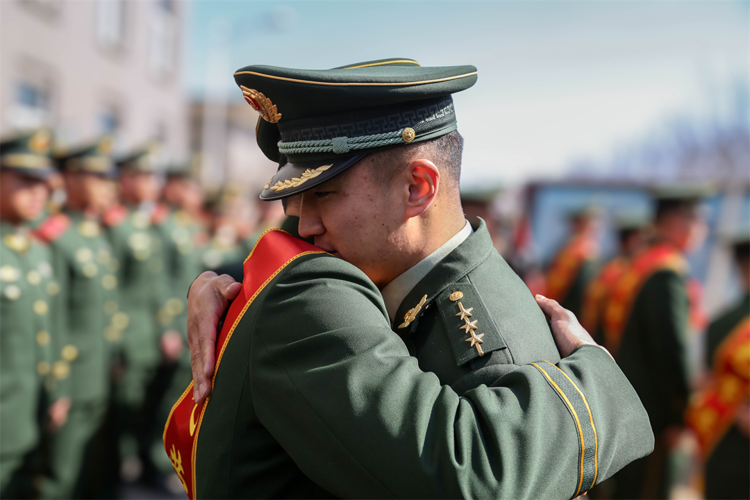 “命令!馬龍等同志退出現(xiàn)役!”退役命令下達后,官兵們紛紛為老兵卸下軍銜和標志服飾,老兵們眼含熱淚與戰(zhàn)友依依惜別,相互表達著美好祝愿。