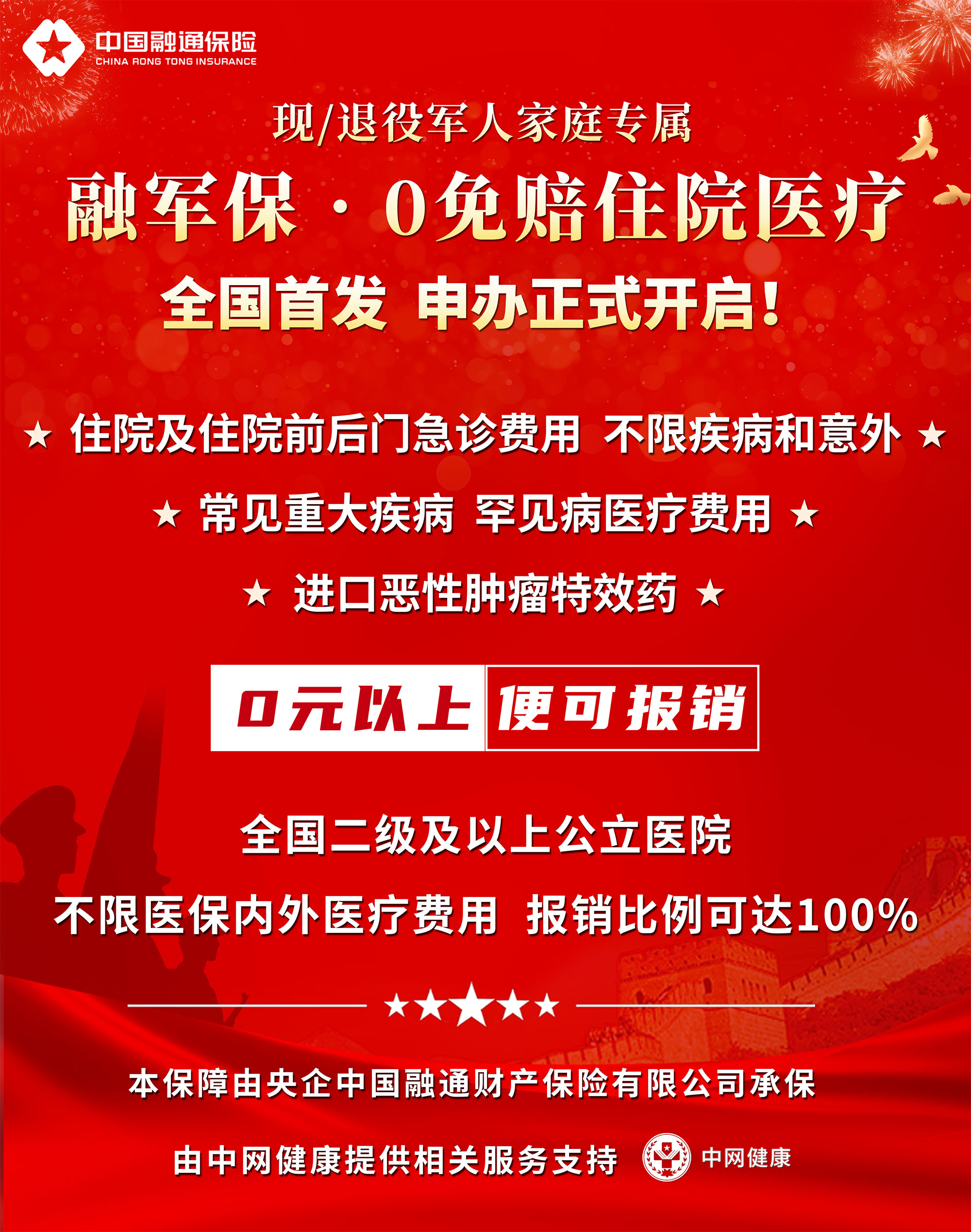 為深入貫徹落實(shí)黨的二十大關(guān)于退役軍人工作重要部署,履行“為軍惠軍”職責(zé)使命,體現(xiàn)中央企業(yè)服務(wù)經(jīng)濟(jì)社會(huì)高質(zhì)量發(fā)展的“國(guó)家隊(duì)、排頭兵”作用,進(jìn)一步提升退役軍人保險(xiǎn)保障水平。中國(guó)融通保險(xiǎn)發(fā)揮自身為軍服務(wù)“專門(mén)化、專業(yè)化”服務(wù)優(yōu)勢(shì),聚焦現(xiàn)/退役軍人家庭醫(yī)療現(xiàn)實(shí)需求,于2024年3月14日,聯(lián)合中網(wǎng)健康正式上線了《融軍?!?免賠住院醫(yī)療》保險(xiǎn)產(chǎn)品。此產(chǎn)品由中國(guó)融通保險(xiǎn)全面負(fù)責(zé)定制研發(fā),由中網(wǎng)健康提供相關(guān)配套服務(wù)支持。該保險(xiǎn)因其“0免賠”的保障優(yōu)勢(shì),真正實(shí)現(xiàn)了“看病住院,小錢(qián)、大錢(qián)均可報(bào)銷”。