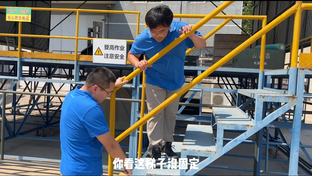“這個梯子沒固定,上下平臺很容易摔倒。”視頻中,小翟叫住正準備登上平臺的小劉,并帶著他一起將四個輪子鎖緊。這是在調(diào)試平臺測試時容易被忽略的一處隱患,視頻通過糾錯的方式,講解登高作業(yè)的操作規(guī)范,讓大家更容易入腦入心。