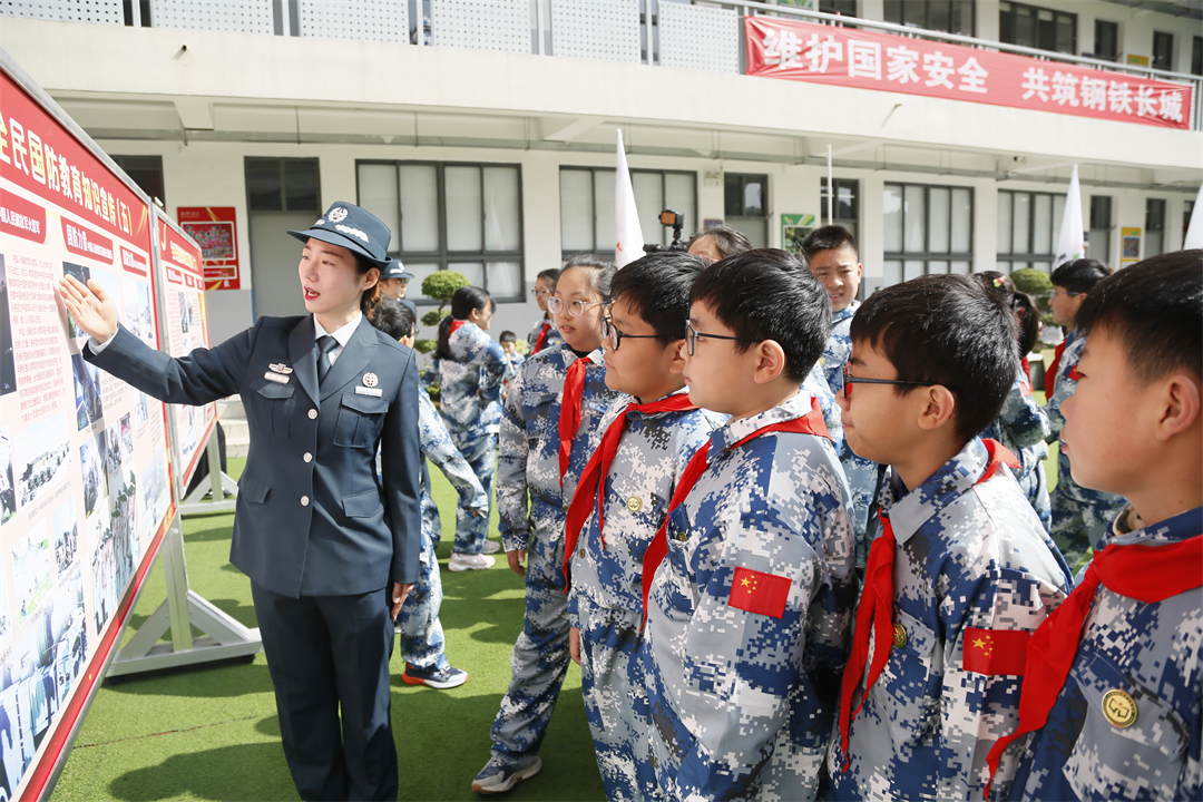 圖為2023年4月7日,南京警備區(qū)進(jìn)校園開展國防教育,文職人員給小學(xué)生介紹國防知識。張永祥 攝