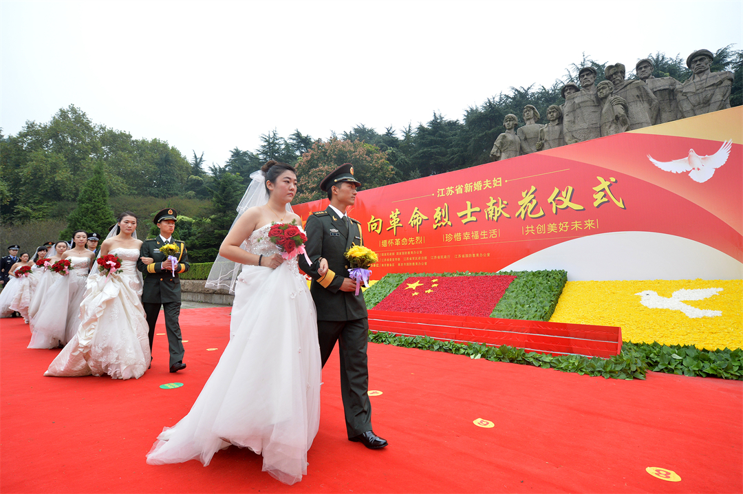 圖為駐寧某部干部劉洋(右一)和妻子劉芮(右二)參加新婚夫婦向革命烈士獻(xiàn)花時(shí)的場景。肖剛 攝