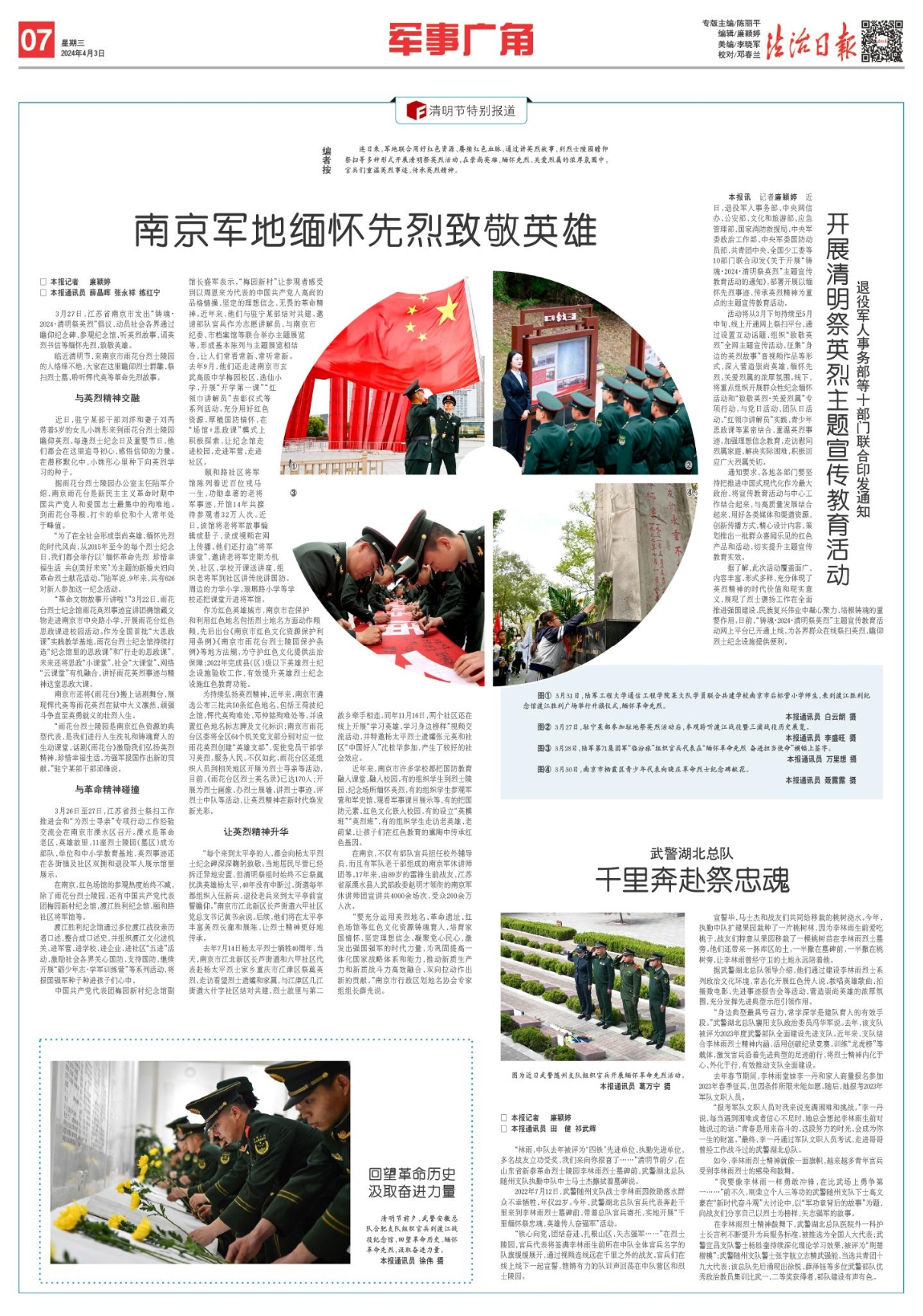 3月27日,江蘇省南京市發(fā)出“鑄魂·2024·清明祭英烈”倡議,動員社會各界通過瞻仰紀(jì)念碑、參觀紀(jì)念館、聽英烈故事、誦英烈書信等緬懷先烈、致敬英雄。