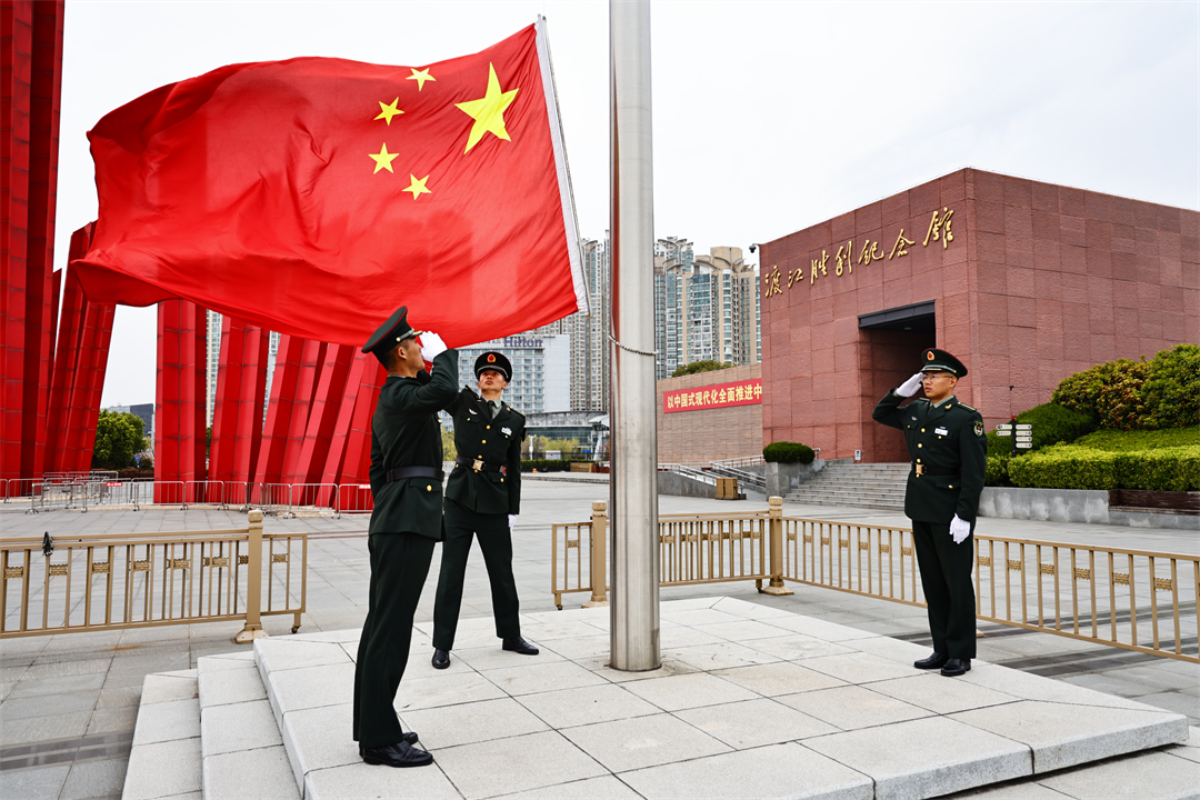 圖為3月31日,陸軍工程大學(xué)通信工程學(xué)院某大隊(duì)學(xué)員聯(lián)合共建學(xué)校南京市后標(biāo)營小學(xué)師生,來到渡江勝利紀(jì)念館渡江勝利廣場舉行升旗儀式,緬懷革命先烈。白云朗 攝