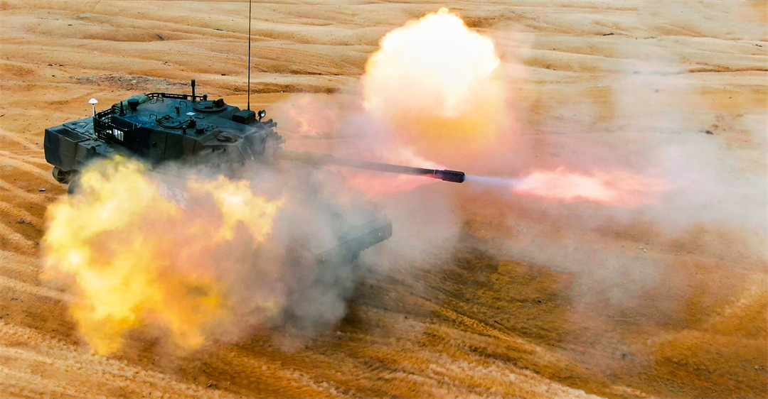 圖為裝甲分隊(duì)采取戰(zhàn)斗隊(duì)形向“敵”陣地實(shí)施火力摧毀,殲滅”敵“裝甲群。劉家軒 攝