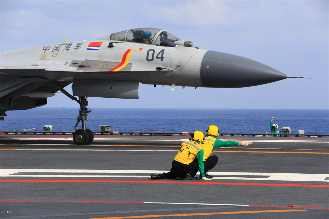 圖為遼寧艦起飛助理作出放飛手勢(shì),殲-15艦載戰(zhàn)斗機(jī)起飛。張凱 攝