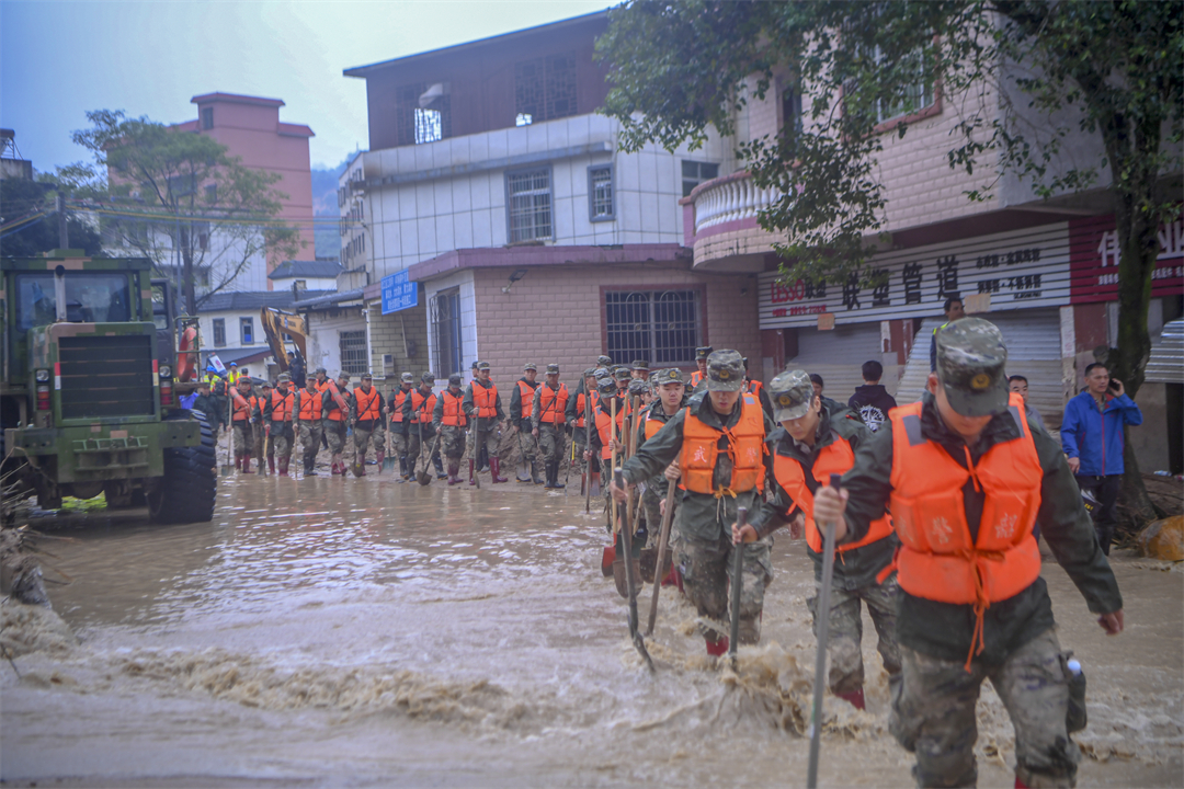“前面塌方,大家把鞋帶系緊一點(diǎn),不然陷到泥里拔不出來(lái)?!苯涤耆栽诶^續(xù),洪水還未退去。進(jìn)山不到200米,偵察股股長(zhǎng)王闖就扯著嗓子喊道,塌方的泥土被雨水沖刷得像一團(tuán)團(tuán)“糨糊”,一腳踩下去就能沒(méi)過(guò)大腿根部。