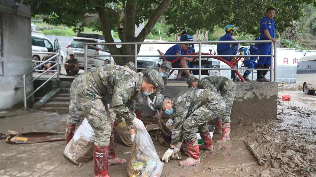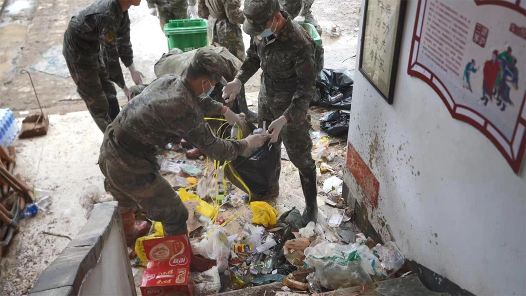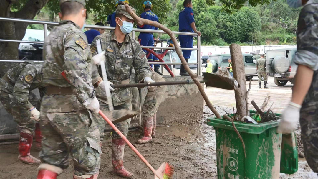 河邊的公路坍塌了近50米,官兵只能繞道山林中繼續(xù)前行,步行2分鐘就能通過(guò)的路程,卻因道路塌方繞行了10分鐘。只見(jiàn)被洪水淹過(guò)的房屋一樓已被覆蓋了一層近10厘米的淤泥,門口“好日子天天開(kāi)心,美生活年年如意”橫幅被暴雨沖刷得破爛不堪,正在清掃淤泥的村民看見(jiàn)武警官兵顯得很興奮:“你們來(lái)了,我們懸著的心就放下來(lái)了,我相信日子會(huì)越來(lái)越好。”