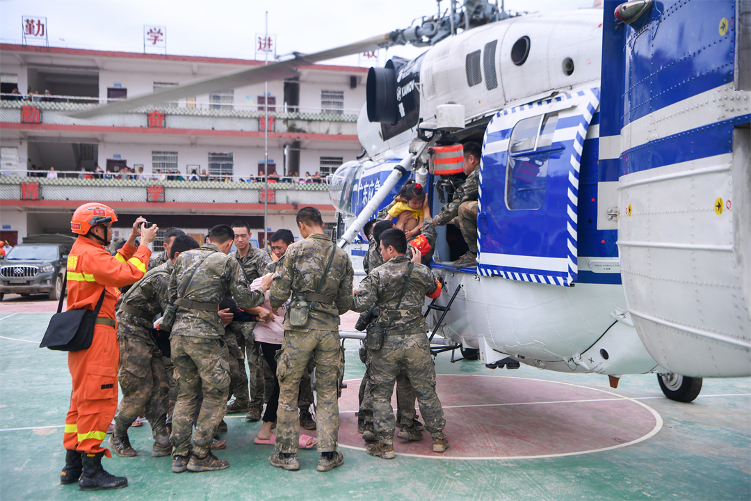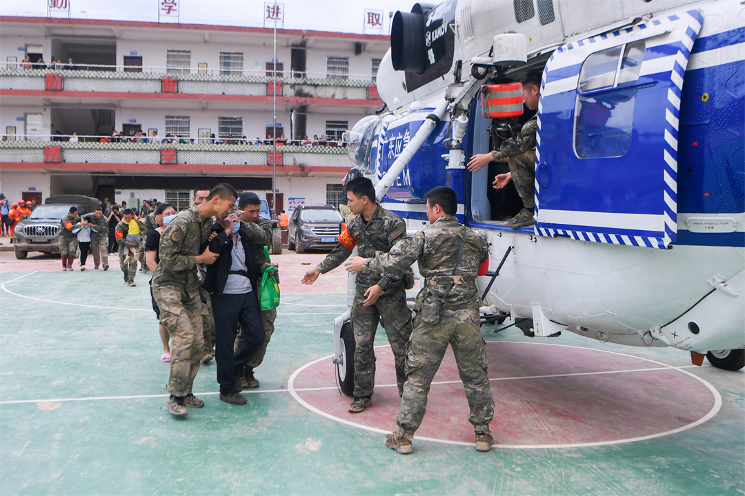 轉(zhuǎn)移工作最難的是梁屋到武洞方向,僅2公里的道路有9處大的塌方點(diǎn),等機(jī)械開道再進(jìn)去轉(zhuǎn)移肯定來不及。楊忠當(dāng)即決定,派出40名兵力徒步進(jìn)村搜索轉(zhuǎn)移,并協(xié)調(diào)聯(lián)指派出直升機(jī)進(jìn)行轉(zhuǎn)運(yùn)。