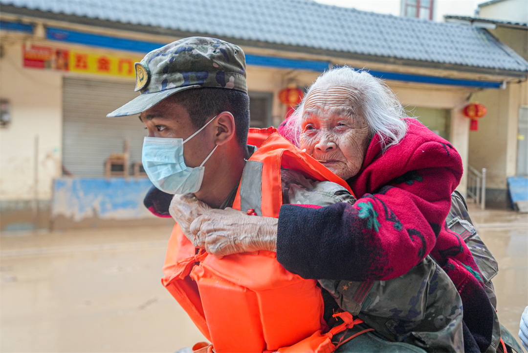 圖為武警廣東總隊(duì)韶關(guān)支隊(duì)官兵派出20名官兵對(duì)江灣鎮(zhèn)城區(qū)片區(qū)進(jìn)行搜樓,轉(zhuǎn)移受難群眾及物資。