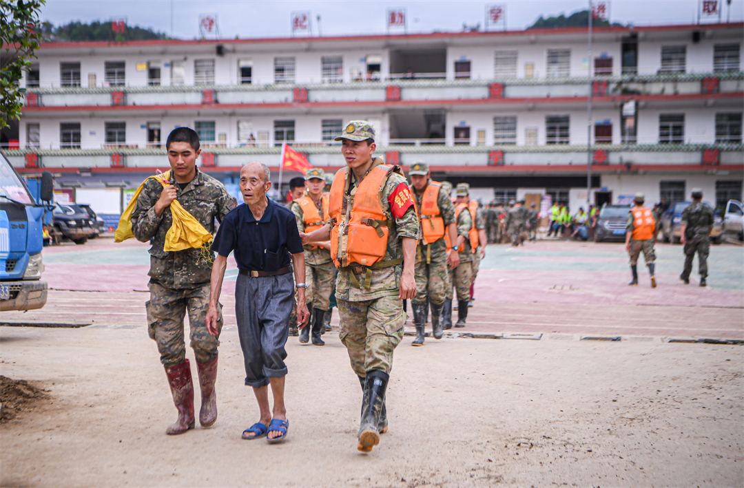 “凌晨6點(diǎn)天還沒亮,所有官兵就帶上干糧出發(fā)到各個(gè)村去疏散群眾?!睏钪艺f,江灣鎮(zhèn)下屬6個(gè)行政村有大大小小43個(gè)自然村,除情況最嚴(yán)重的梁屋村派出60人外,鍋溪村、圍坪村、江灣中心小學(xué)各派出30名兵力,胡屋村派出40名兵力,劃分若干個(gè)小組,聯(lián)合地方救援人員,按照先遣勘察、重裝開道、輕裝跟進(jìn)、觀察警戒的方式,逐村逐戶搜索勸離,剩余人員就在江灣中學(xué)和江灣鎮(zhèn)政府協(xié)助轉(zhuǎn)運(yùn)群眾。