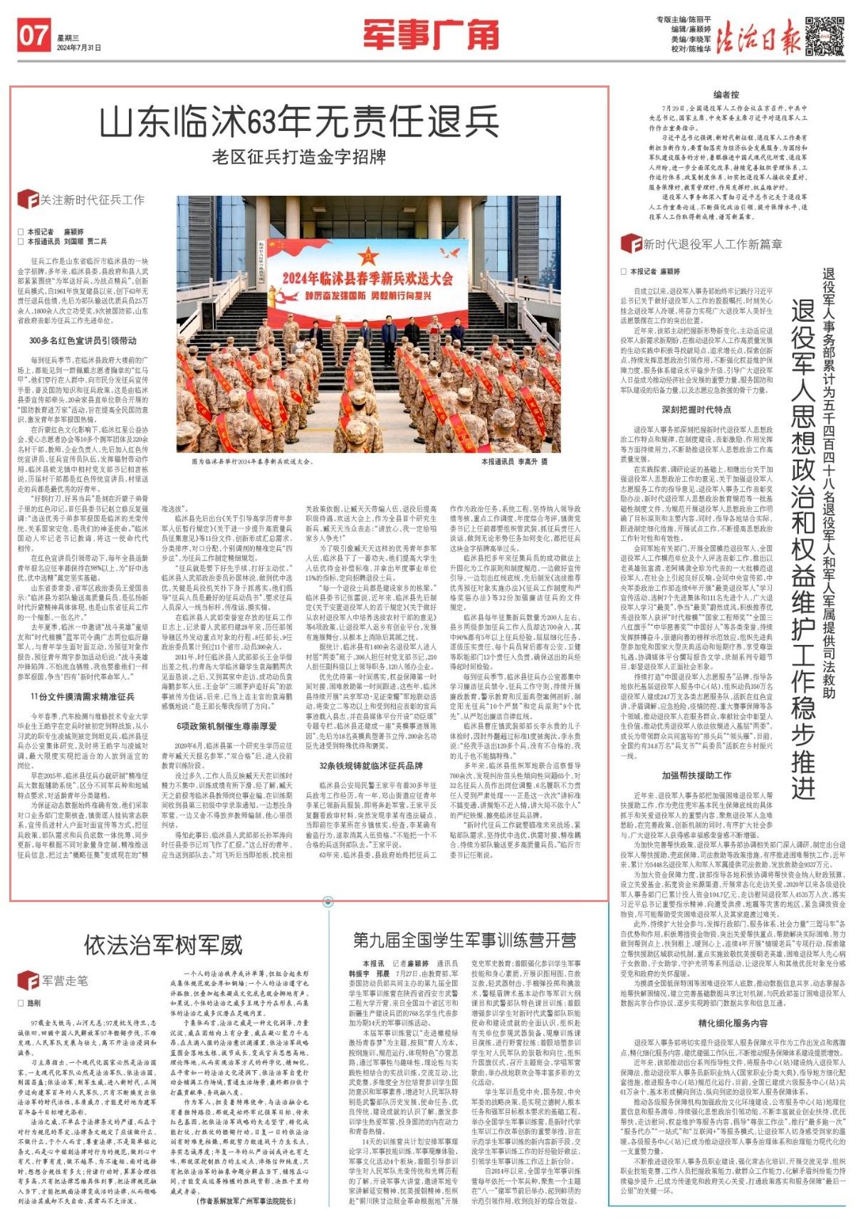 優(yōu)先優(yōu)待第一時間落實,權(quán)益保障第一時間對接,困難救助第一時間跟進。這些年,臨沭縣持續(xù)開展“共享軍功·見證榮耀”軍地聯(lián)動活動,將榮立二等功以上和受到相應(yīng)表彰的官兵事跡載入縣志,并在縣媒體平臺開設(shè)“功臣頌”專題專欄。臨沭縣還建成一座“英模事跡展陳園”,先后為18名英模典型著書立傳,200余名功臣先進受到特殊優(yōu)待和褒獎。