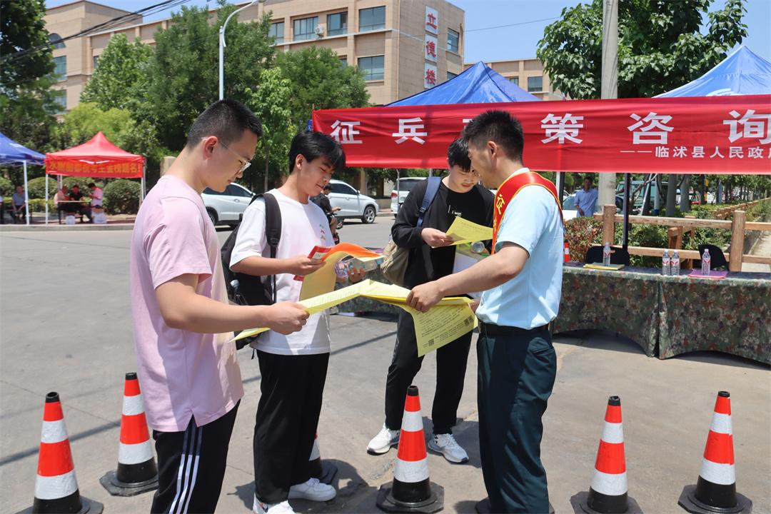 圖為臨沭縣征兵工作人員向應(yīng)征青年發(fā)放征兵政策宣傳單。