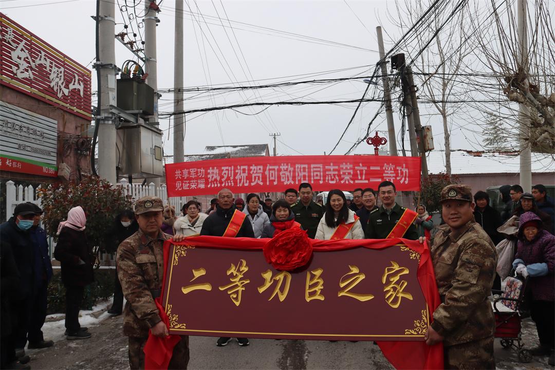 圖為臨沭縣軍地領(lǐng)導(dǎo)為榮立二等功人員送喜報。