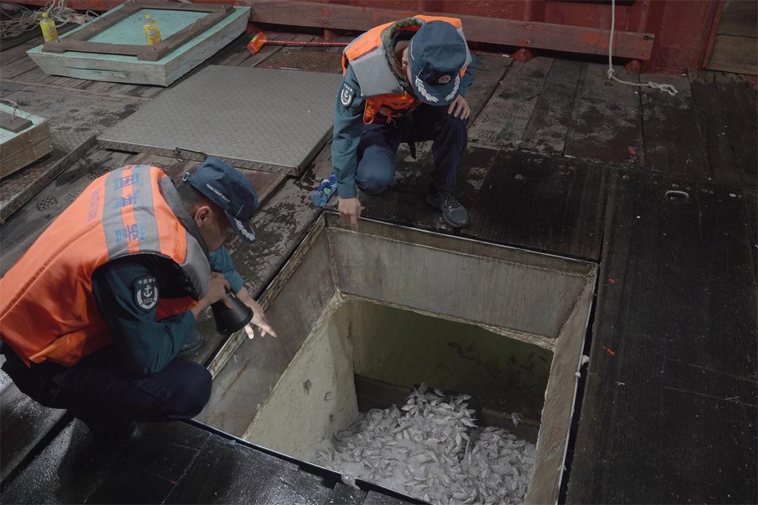 圖為5月9日,廣東陽江海警局在陽江附近海域查獲一批涉嫌非法捕撈漁獲物,執(zhí)法員檢查涉案船只。