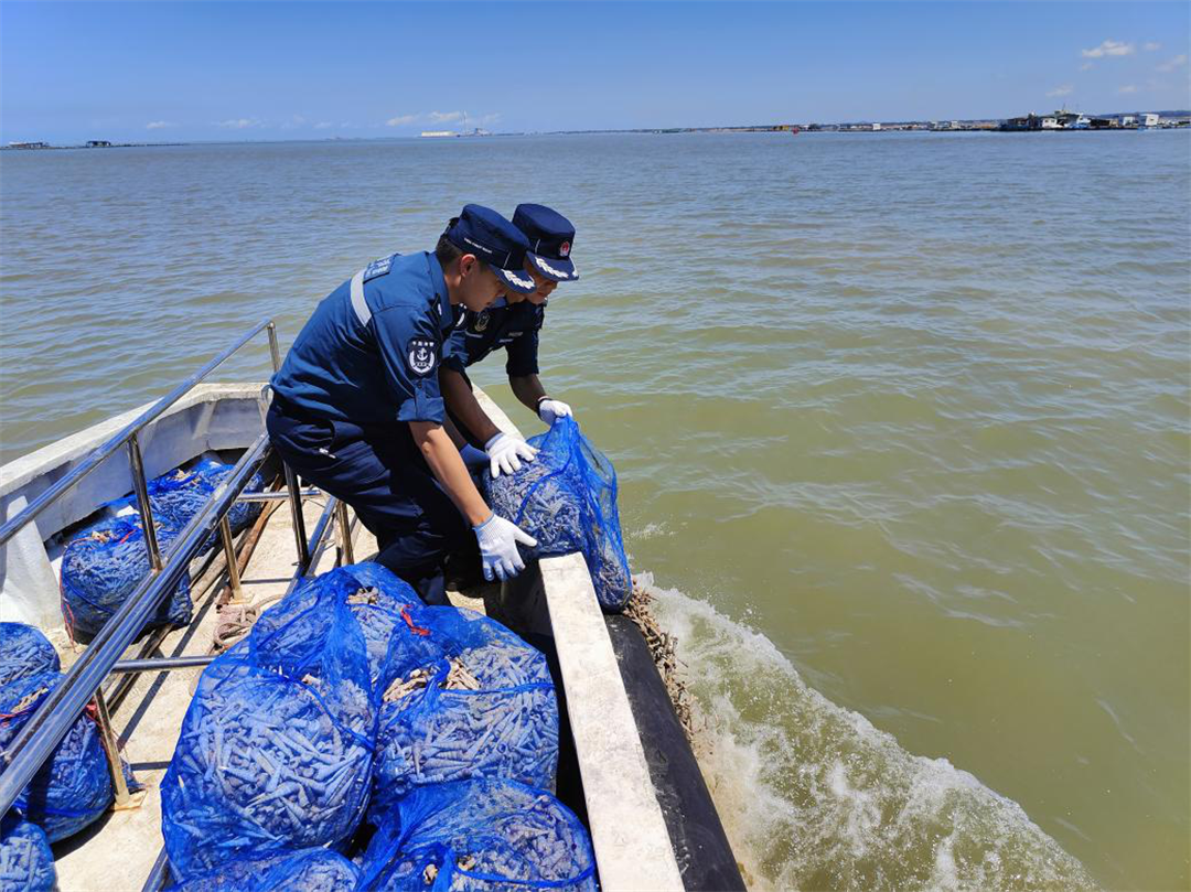 圖為8月3日,廣東湛江海警局在湛江附近海域抓獲一艘非法捕撈漁船,執(zhí)法員依法對非法捕撈活體漁獲物進(jìn)行放生處理。