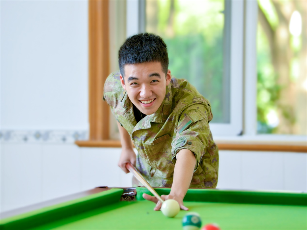 圖為下士吳凱翔在臺球室最后一次與戰(zhàn)友PK。