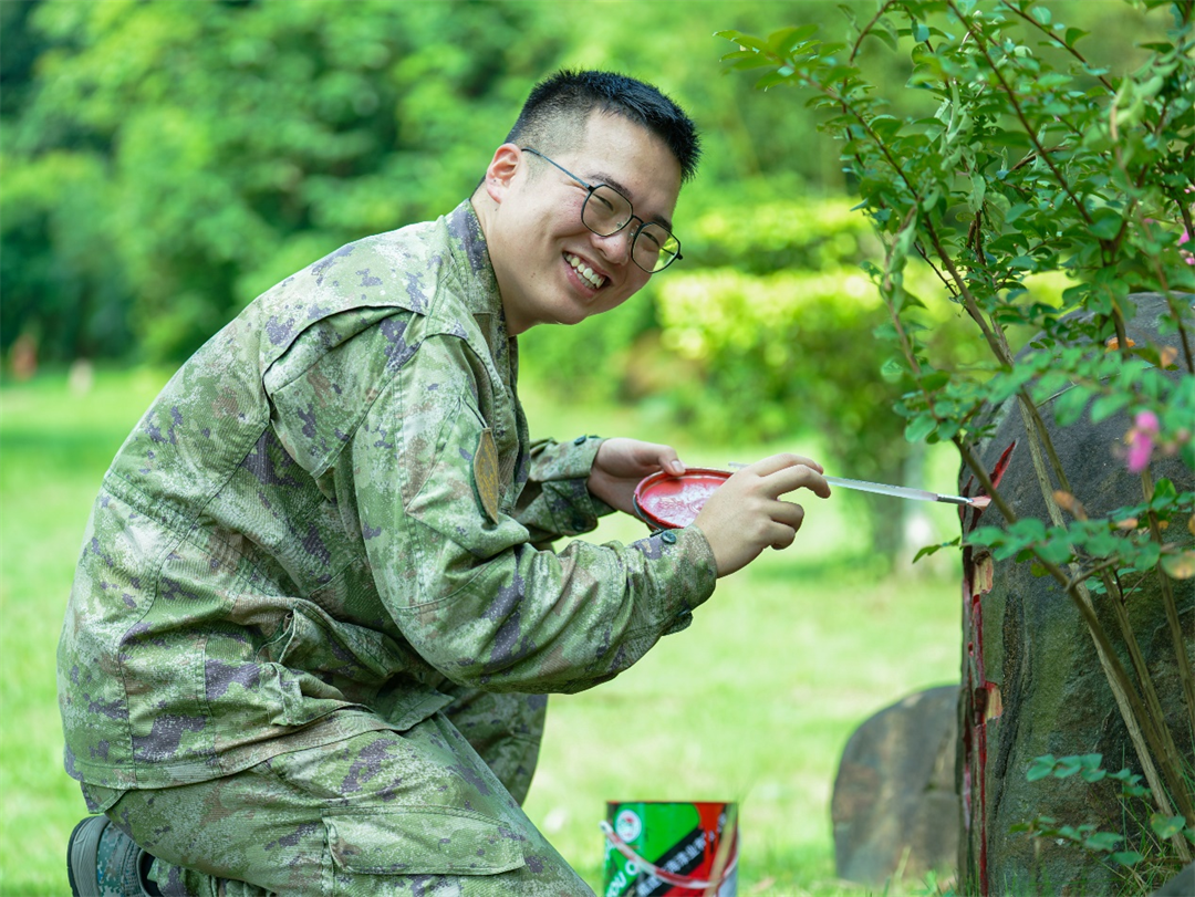 圖為上等兵黃琳楠最后一次為刻字石描紅。