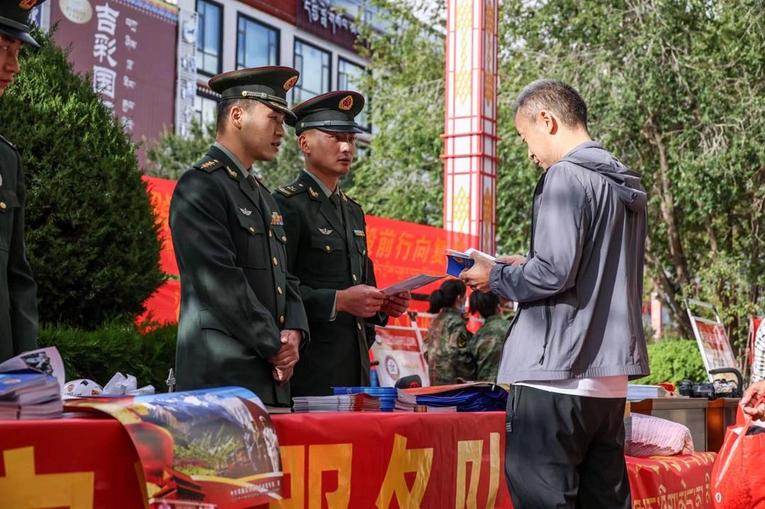 圖為解放軍拉薩軍事法院和西藏拉薩警備區(qū)官兵向群眾宣傳國(guó)防知識(shí)。黎遠(yuǎn)華 攝