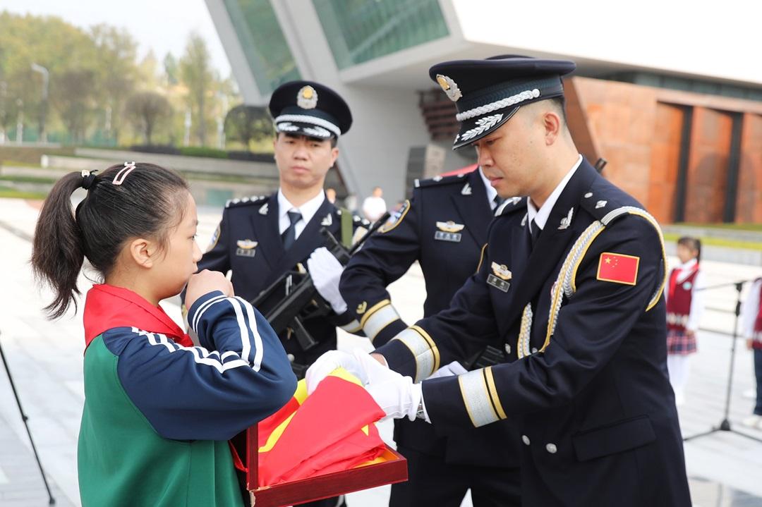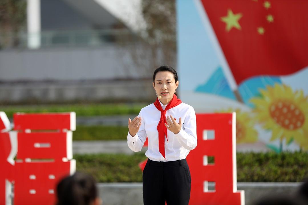 國(guó)旗下,全國(guó)紅領(lǐng)巾巡講團(tuán)成員田慧以“第一顆原子彈爆炸成功背后的故事”為題進(jìn)行宣講,激勵(lì)少先隊(duì)員們熱愛祖國(guó),樹立遠(yuǎn)大理想。綿陽(yáng)高新區(qū)火炬實(shí)驗(yàn)小學(xué)五(4)中隊(duì)少先隊(duì)員唐萌韓分享了參加“與航天員面對(duì)面”活動(dòng)的感受,展現(xiàn)新時(shí)代少先隊(duì)員勇敢探索和對(duì)科學(xué)的執(zhí)著追求。