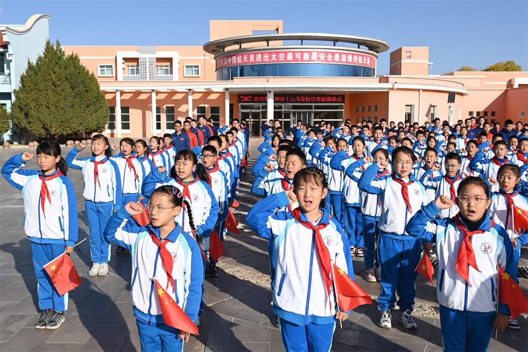 活動現(xiàn)場,少先隊員整齊列隊,鼓樂隊奏響嘹亮的樂曲,科技人員代表莊嚴(yán)地將國旗交到東風(fēng)小學(xué)校長劉湫蘋手中,少先隊員護旗手們將這面滿載著祖國榮譽的國旗徐徐展開。