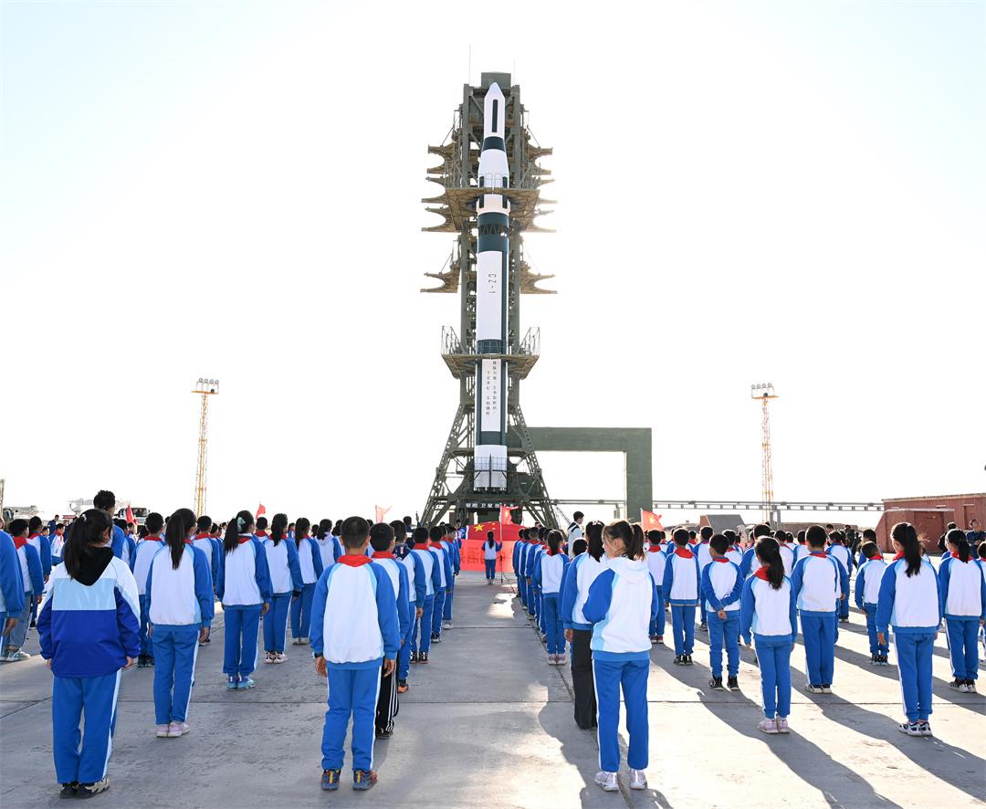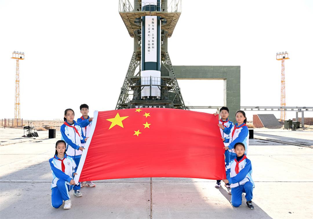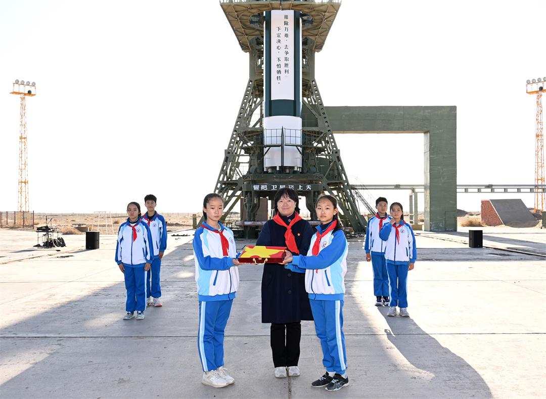 隨后,少先隊員們帶著國旗前往載人航天發(fā)射場。神舟十九號載人飛船發(fā)射任務(wù)0號指揮員趙磊為少先隊員們介紹了這座我國目前唯一的載人航天發(fā)射塔架。就在前幾天,神舟十九號航天員乘組從這里飛向中國空間站。截至目前,這里發(fā)射了19艘神舟飛船,將24名38人次航天員送入太空。這面滿載榮譽的國旗正是從這個塔架上隨航天員一同進(jìn)入中國空間站。
