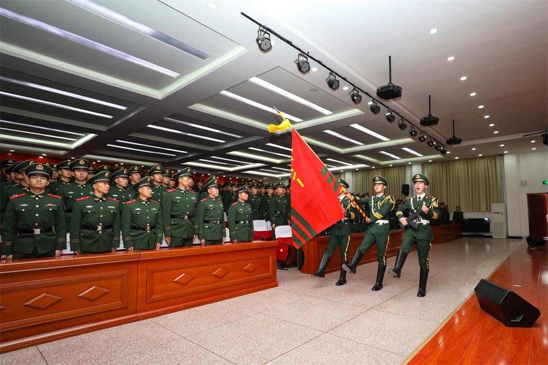 儀式在雄壯的中國人民解放軍軍歌聲中拉開帷幕?!坝渚筷犉?!”隨著口令下達,三名擎旗手高舉武警部隊旗正步走過臺前,全體新兵軍姿挺拔、精神昂揚,向武警部隊旗行注目禮。