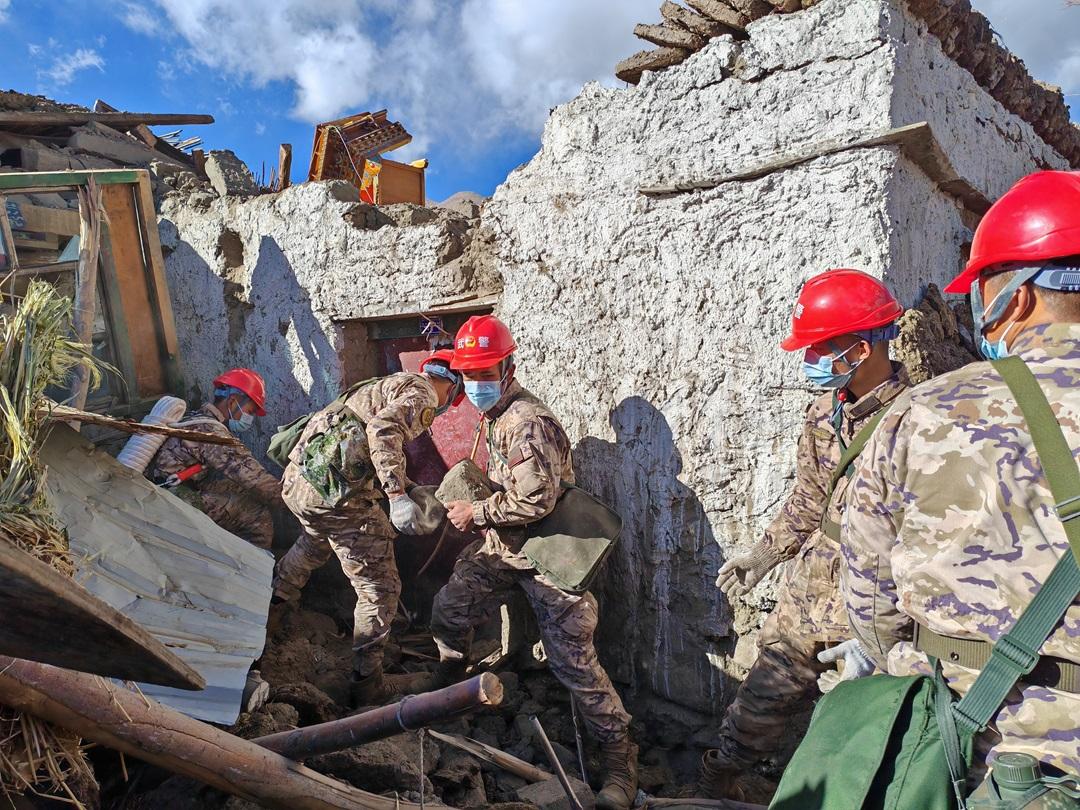圖為武警西藏總隊日喀則支隊官兵在定日縣長所鄉(xiāng)嘎丹村搶救群眾財產(chǎn)。張鈺 攝