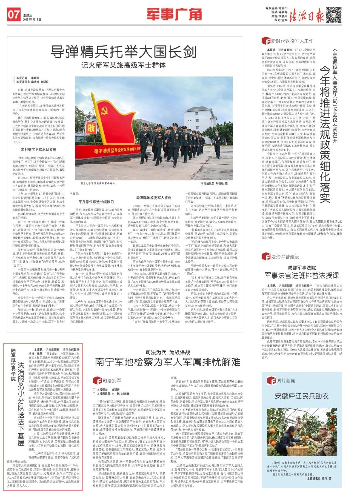從三晉大地到蜀南竹海,法治服務(wù)小分隊(duì)每到一個(gè)單位,都受到官兵熱烈歡迎。不到一周時(shí)間,他們晝夜兼程、輾轉(zhuǎn)多地,理論文藝服務(wù)官兵數(shù)千人,心理疏導(dǎo)、醫(yī)療診療官兵百余人,為官兵解答涉法涉訴問題20余件。陸軍航空兵學(xué)院領(lǐng)導(dǎo)表示,到基層進(jìn)行巡回服務(wù),目的就是讓法治精神、法治理念深入基層、深入人心。