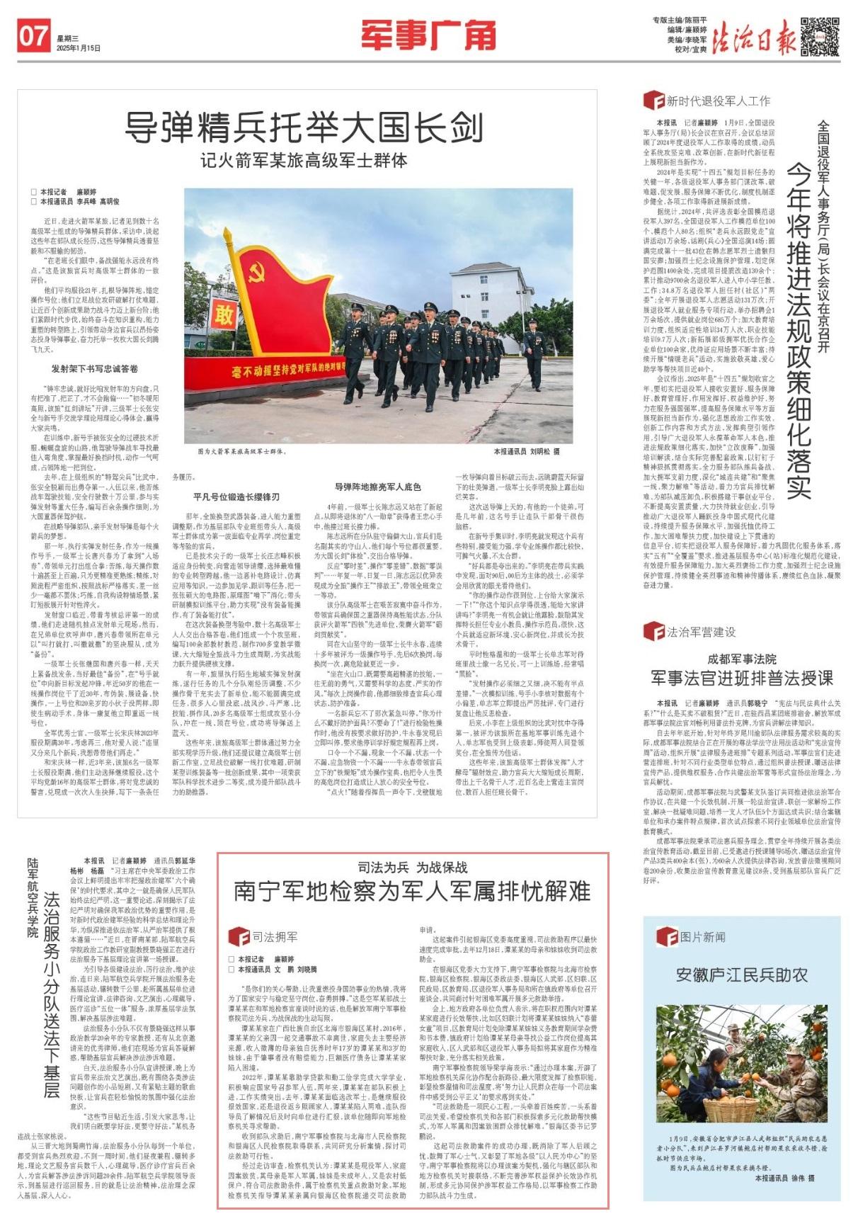 “是你們的關(guān)心幫助,讓我重燃投身國(guó)防事業(yè)的熱情,我將為了國(guó)家安寧與穩(wěn)定堅(jiān)守崗位、奮勇拼搏?!边@是空軍某部戰(zhàn)士譚某某在和軍地檢察官座談時(shí)說(shuō)的話(huà),也是解放軍南寧軍事檢察院司法為兵、為戰(zhàn)保戰(zhàn)的生動(dòng)寫(xiě)照。