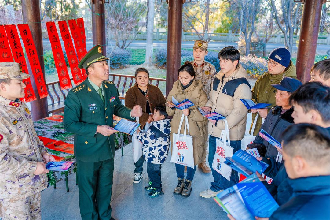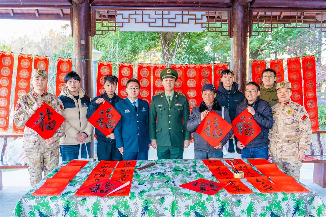 1月15日,安徽省馬鞍山市博望區(qū)人武部組織現(xiàn)役官兵、文職人員、基干民兵走進(jìn)村鎮(zhèn)文化中心廣場(chǎng),開展“寫春聯(lián)·送祝?!び麓骸蔽繂枌m?xiàng)活動(dòng)。圖為官兵給駐地群眾送上新春祝福。