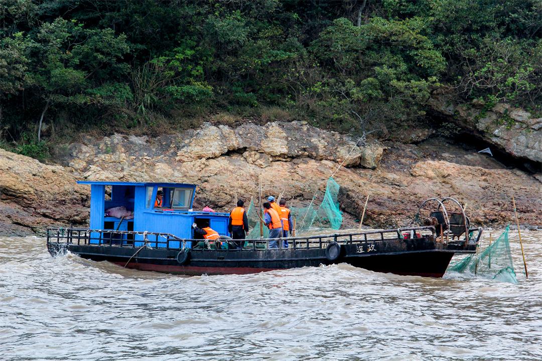 圖為大榭街道清除軍港周邊海域違法設(shè)置的漁網(wǎng)。