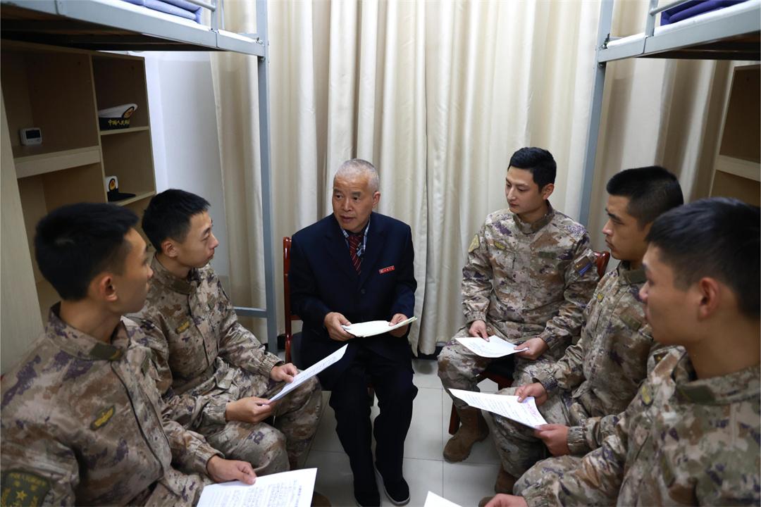 圖為大榭中學(xué)退休教師胡四海(左三)向官兵分享師生與駐南沙島礁官兵“鴻雁傳書(shū)”的故事。