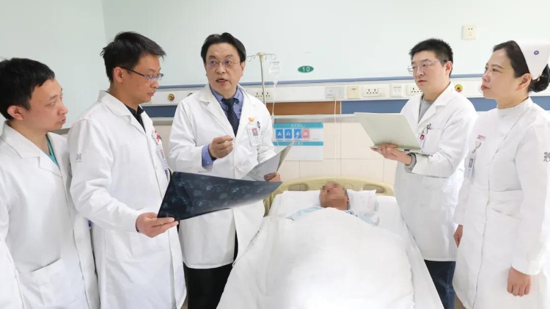 圖為姜凱主任帶領(lǐng)團(tuán)隊(duì)醫(yī)務(wù)人員在查房中討論病情,并指導(dǎo)手術(shù)后的病人進(jìn)行科學(xué)訓(xùn)練,加快康復(fù)進(jìn)度。