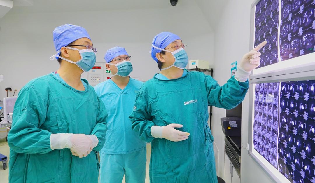 圖為姜凱主任團(tuán)隊(duì)一邊查閱核磁膠片一邊討論手術(shù)細(xì)節(jié),制定周密方案,確保手術(shù)萬無一失。