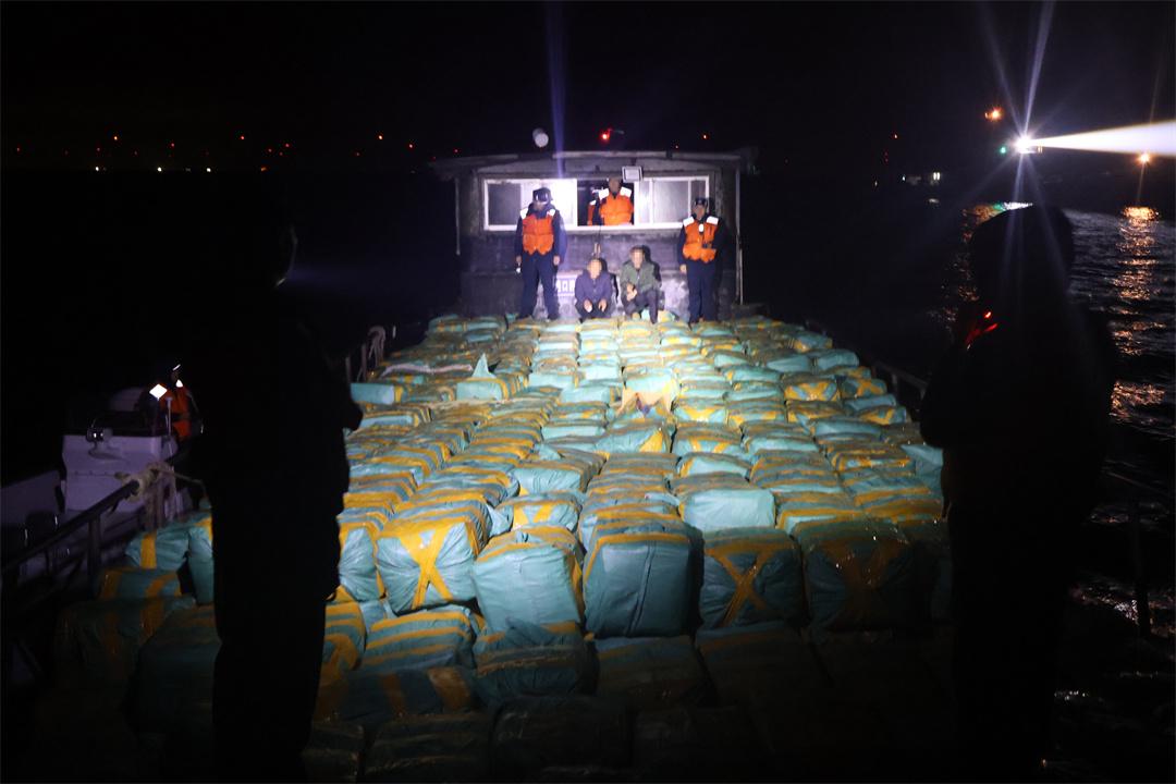 圖為2月20日,廣西海警局在廣西珍珠灣海域查獲香煙19996條。