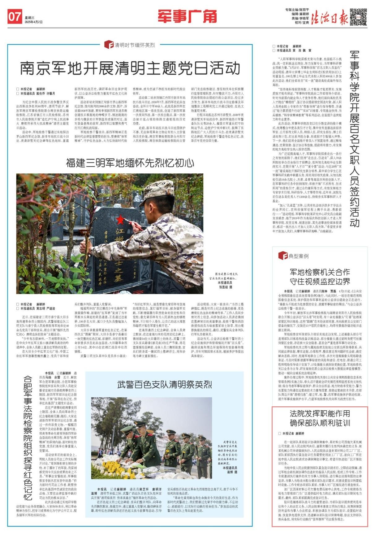 駐訓(xùn)是錘煉部隊(duì)?wèi)?zhàn)斗力的重要途徑,為部隊(duì)駐訓(xùn)提供便利是單位和個(gè)人的法定義務(wù)。人民法院秉承善意文明執(zhí)行理念,統(tǒng)籌保障國防利益和當(dāng)事人合法權(quán)益,積極協(xié)調(diào)各方為部隊(duì)駐訓(xùn)、設(shè)置臨時(shí)設(shè)施、恢復(fù)供電提供支持,迅速解決部隊(duì)駐訓(xùn)保障難題,依法支持部隊(duì)練兵備戰(zhàn),用實(shí)際行動(dòng)踐行“崇軍擁軍”司法服務(wù)理念。
