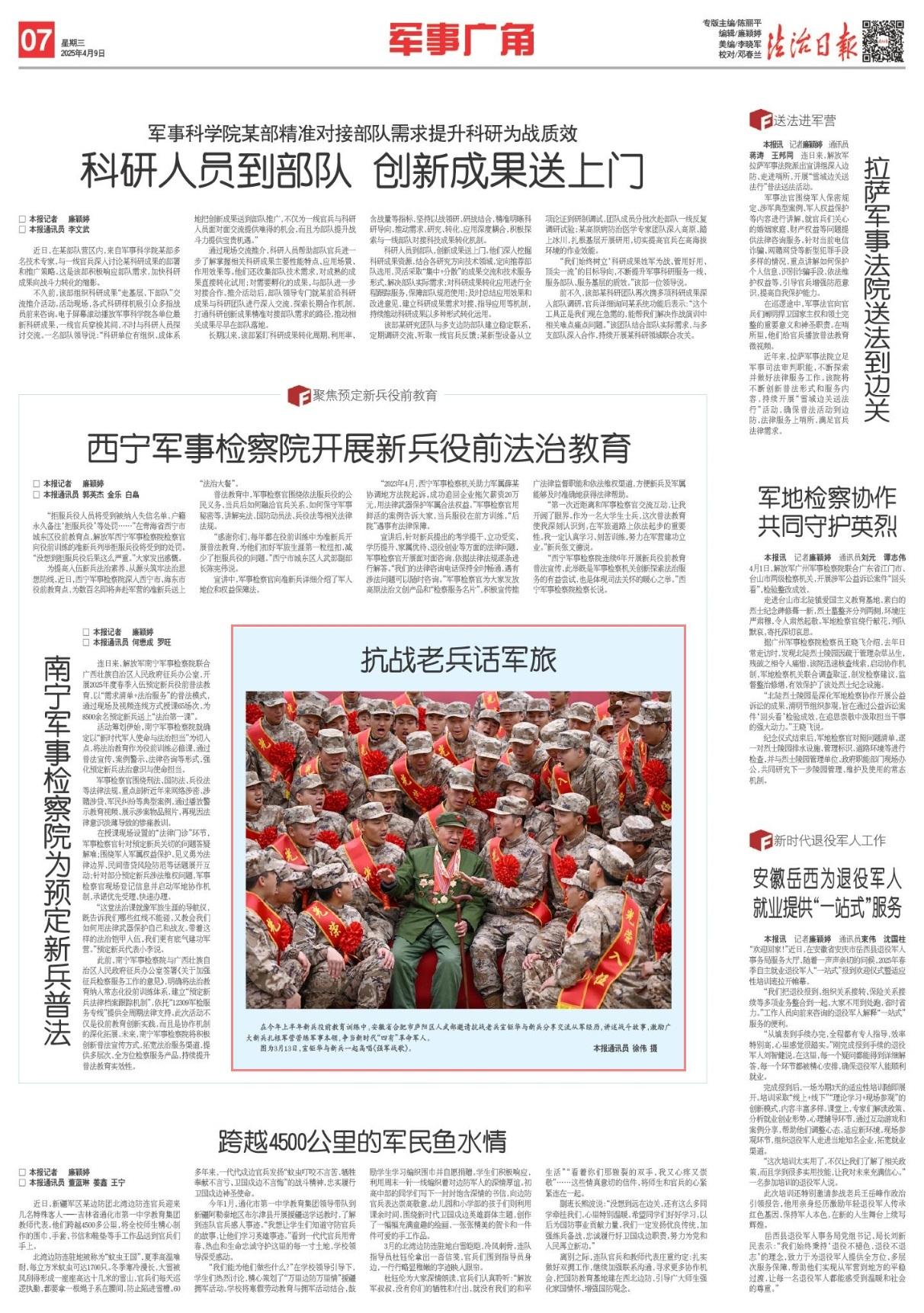 在今年上半年新兵役前教育訓練中,安徽省合肥市廬陽區(qū)人武部邀請抗戰(zhàn)老兵宣鉅華與新兵分享交流從軍經(jīng)歷,講述戰(zhàn)斗故事,激勵廣大新兵扎根軍營苦練軍事本領(lǐng),爭當新時代“四有”革命軍人。