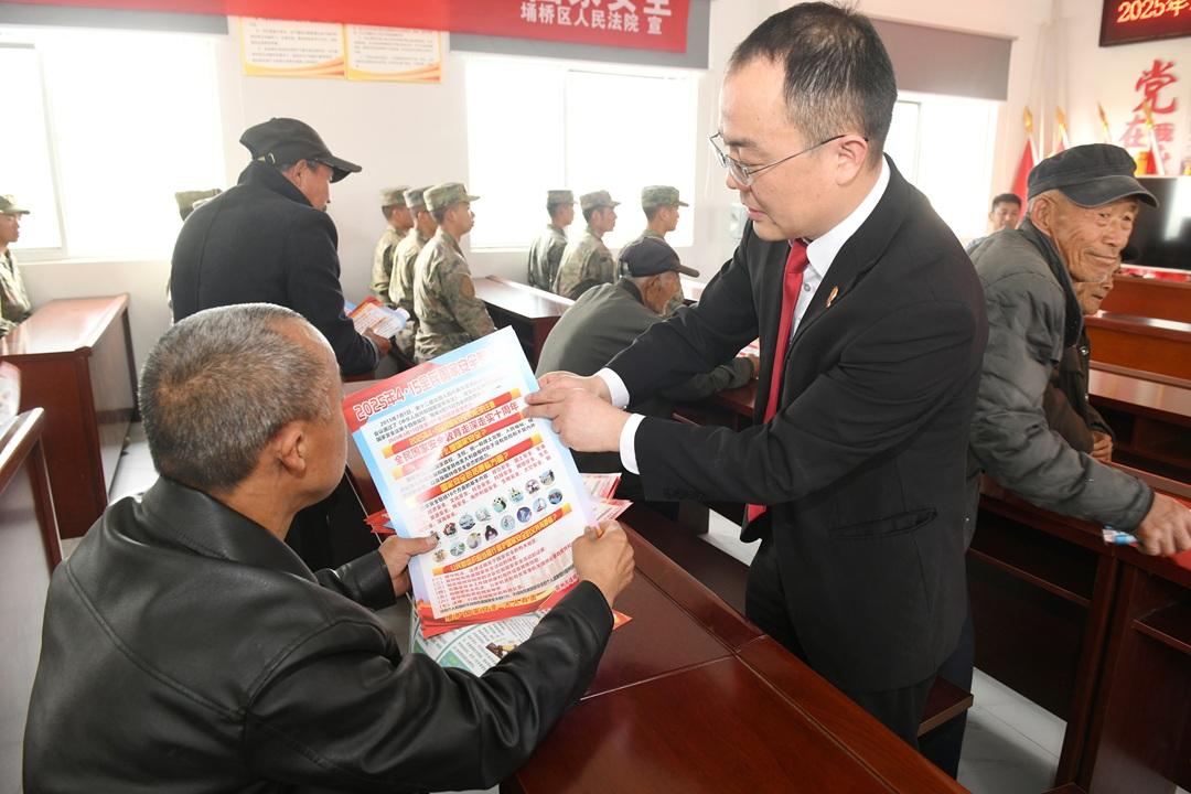 圖為法官給群眾發(fā)放普法宣傳彩頁(yè)。