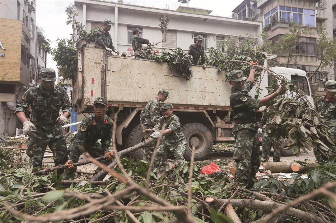 “紅色前哨連”聞令而動,官兵們在齊腰深的海水中摸索前行,赤腳涉險1公里抵達災區(qū)。面對情侶路被海水倒灌、樹木橫阻的險情,60余名官兵連續(xù)3天每天奮戰(zhàn)10小時,用斧頭劈開倒伏樹干,徒手搬運數(shù)百斤樹枝,清理被淹車輛十余臺,轉移群眾30余人,疏通情侶南路3.7公里。
