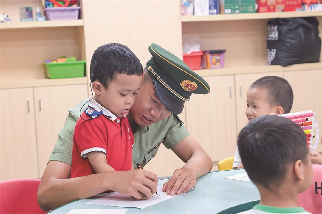 圖為“紅色前哨連”官兵與聾啞兒童互動教學。