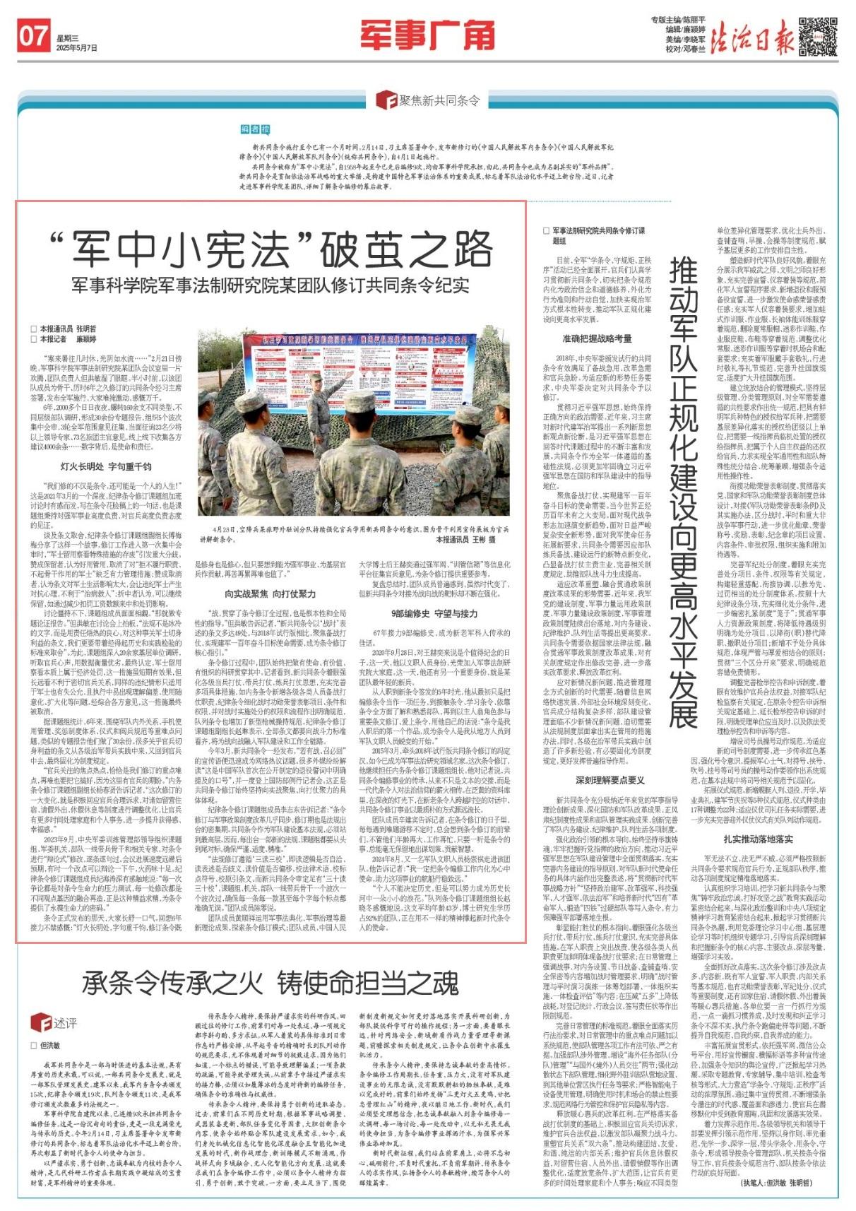 2015年3月,牽頭2018年試行版共同條令修訂的馮定漢,如今已成為軍事法治研究領(lǐng)域名家。這次條令修訂,他繼續(xù)擔(dān)任內(nèi)務(wù)條令修訂課題組組長(zhǎng)。他對(duì)記者說(shuō),共同條令編修事業(yè)的傳承,從來(lái)不只是文本的交接,而是一代代條令人對(duì)法治信仰的薪火相傳。在泛黃的資料庫(kù)里,在深夜的燈光下,在新老條令人跨越時(shí)空的對(duì)話中,共同條令修訂事業(yè)以最質(zhì)樸的方式源遠(yuǎn)流長(zhǎng)。