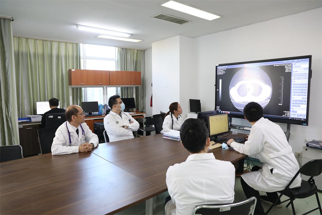 圖為胸外科主任宋偉安帶領(lǐng)團(tuán)隊(duì)研究胸部CT和病情資料。