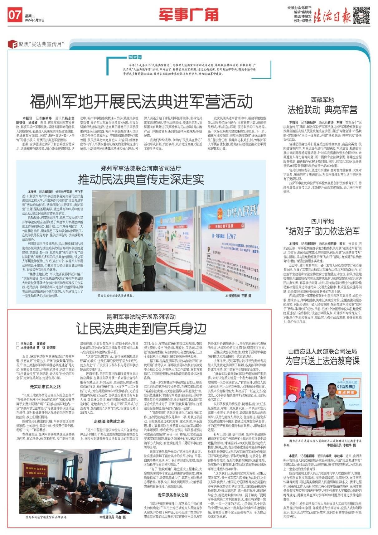 近日,解放軍昆明軍事法院通過(guò)“典亮軍營(yíng)、法惠官兵”專題送法、開(kāi)展“旅院聯(lián)建”活動(dòng)、召開(kāi)“突出類(lèi)型涉軍糾紛案件協(xié)調(diào)推進(jìn)會(huì)”等方式,在駐云貴各部隊(duì)開(kāi)展形式多樣、內(nèi)容豐富的“民法典宣傳月”系列活動(dòng),讓這部“社會(huì)的百科全書(shū)”走到官兵身邊,走進(jìn)官兵心里。